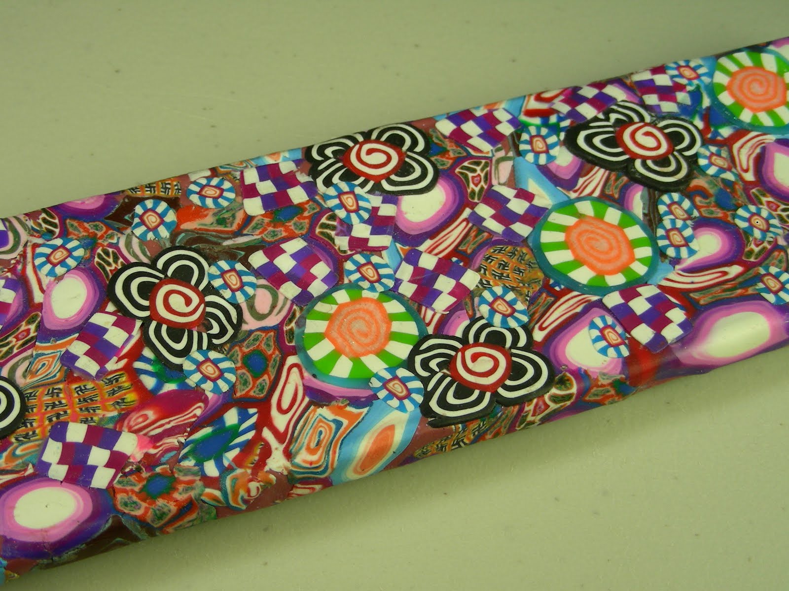 I made this polymer clay cuff last night. I bent an aluminum band into a cuff and then covered it with a pre-blended jade color strip of clay. Then I applied slices of canes to the raw clay. I had some leftover leaf canes and geometrics (which made some nice abstract flowers).
